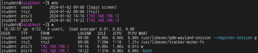 현재 로그인한 사용자 뿐만 아니라 활동에 대한 정보 나열, w 명령으로 더 자세한 정보까지 출력
