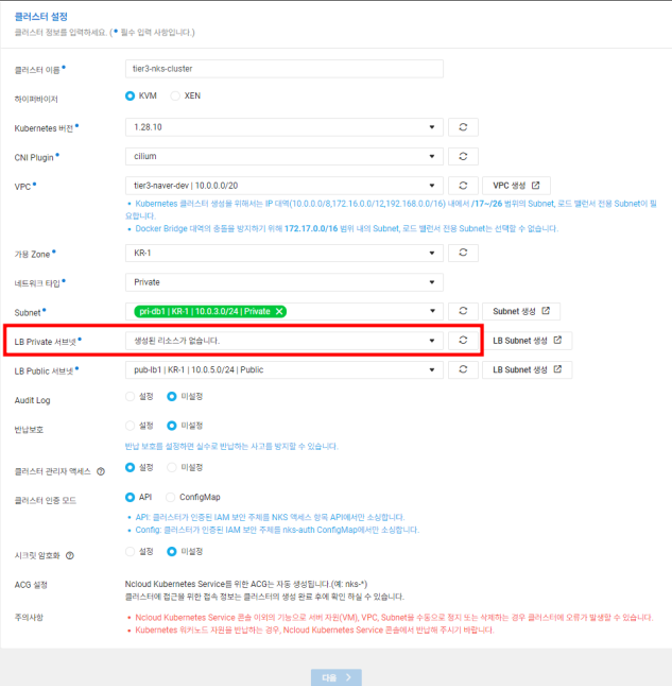ncloud의 kubernetes 생성을 위해서는 VPC, NAT Gateway와 kubernetes를 배치할 서브넷, LB public/private까지 3개의 서브넷이 있어야 다음으로 넘어갈 수 있습니다.