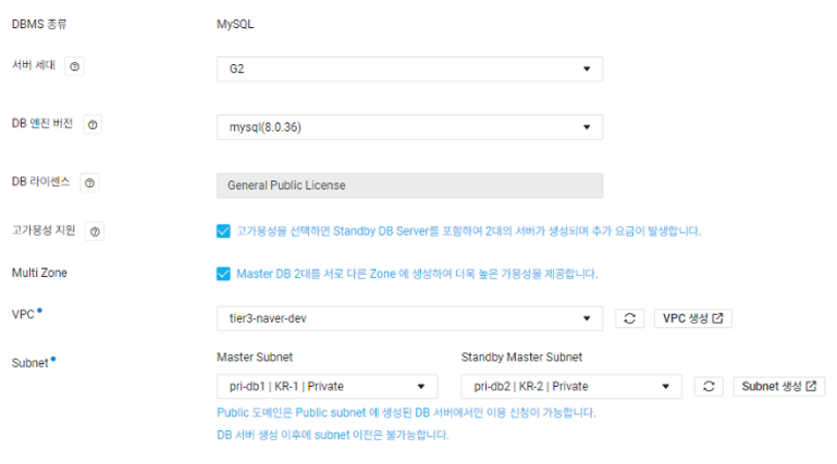 DB의 버전 등을 선택해주고 클릭 한 번으로 간단히 멀티 zone의 stanby DB server 까지 구축할 수 있었습니다.