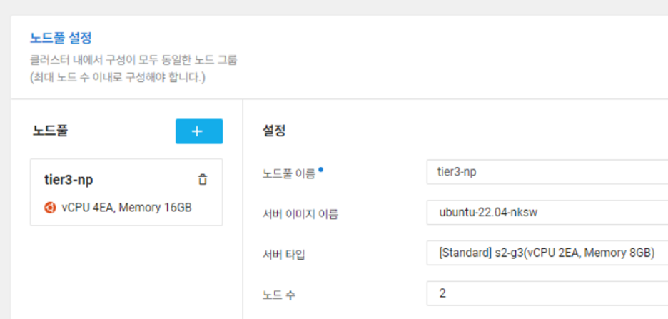 kubernetes cluster의 노드풀을 생성해줍니다. 서버 타입과 노드 수 등을 선택한 후 등록해줍니다.