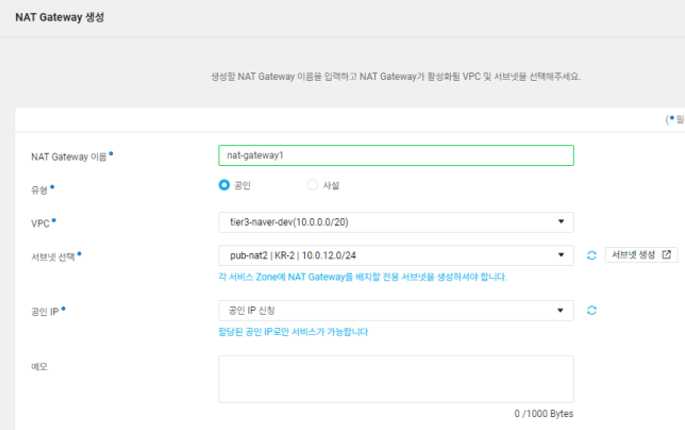 기존에 생성한 VPC와 NAT 전용 서브넷을 연결하여 NAT Gateway를 생성해줍니다.