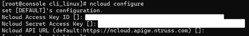 인증 정보를 등록하기 위해 ncloud configure 명령으로 Access Key / Secret Access Key를 등록해줍니다.