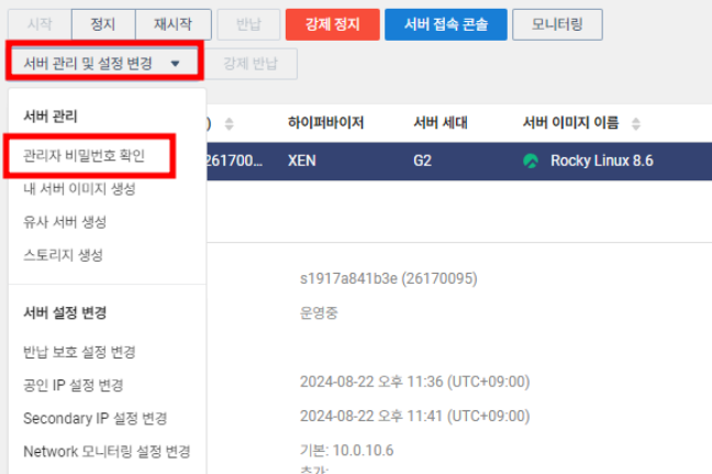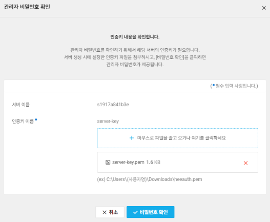 서버 관리 및 설정 변경 > 관리자 비밀번호 확인 > 서버 생성시 등록한 키파일 업로드
