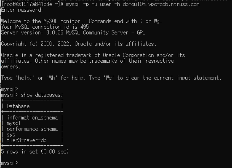 mysql -p -u <생성한 관리자명> -h <DB 주소>