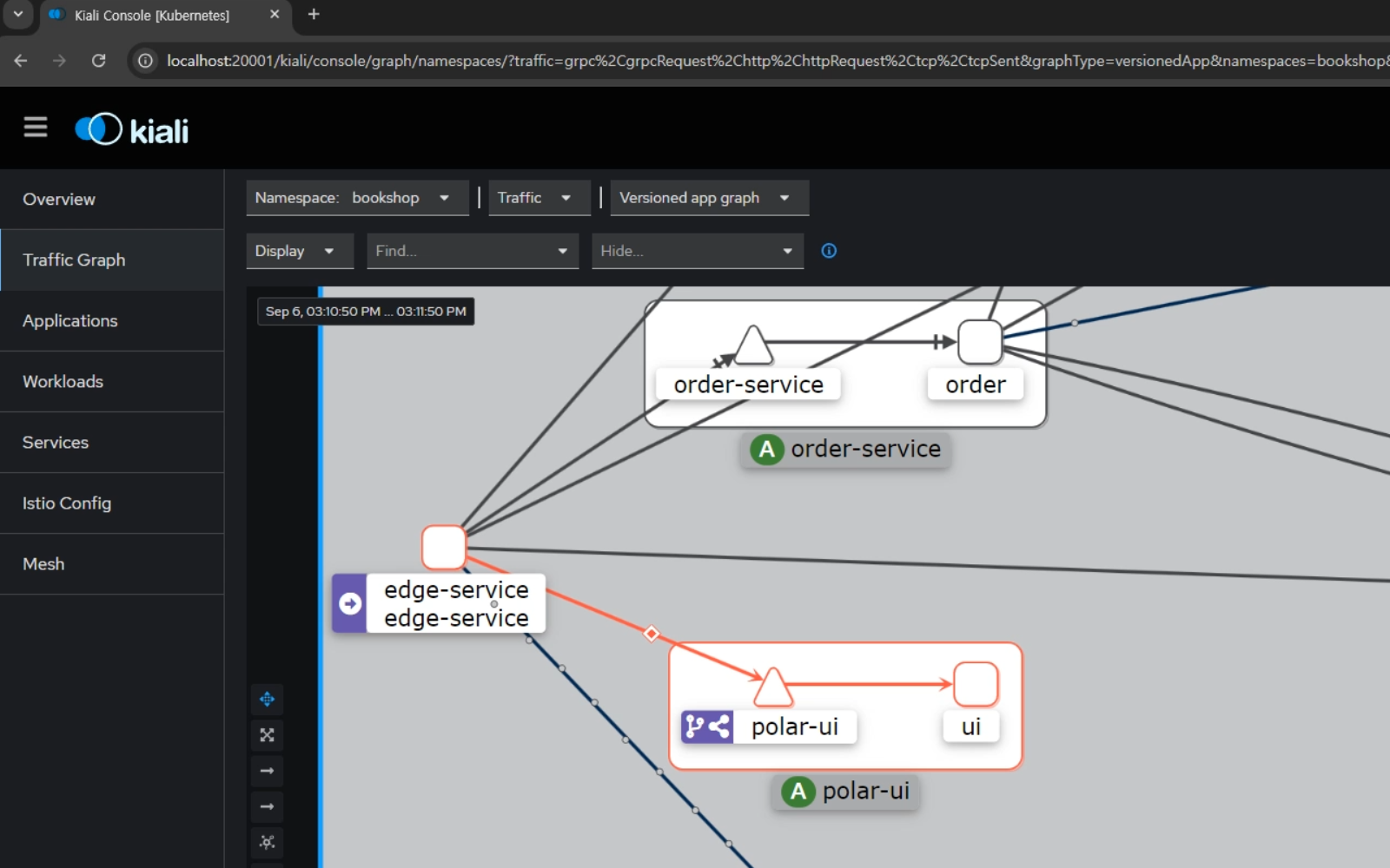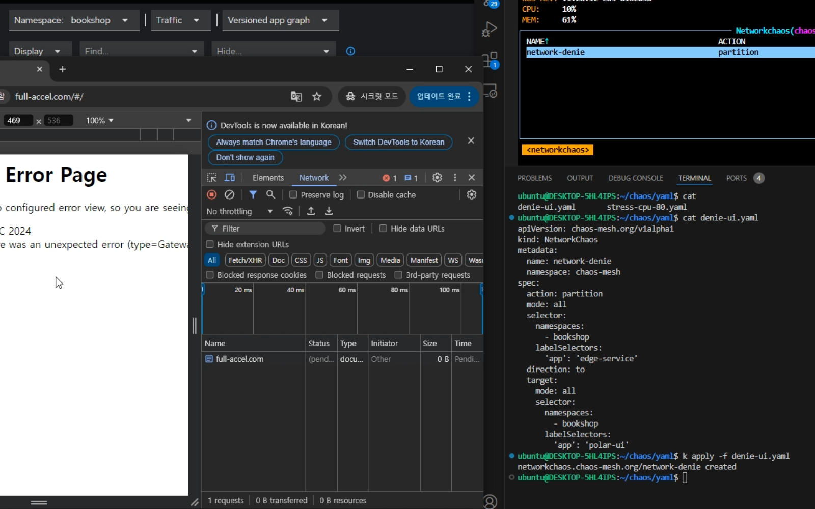 'app': 'polar-ui'사용자가 full-accel.com이라는 도메인으로 접속할 시에 연결되는 edge-service와 polar-ui간의 접속을 NetworkChaos 리소스를 통해 차단했다.