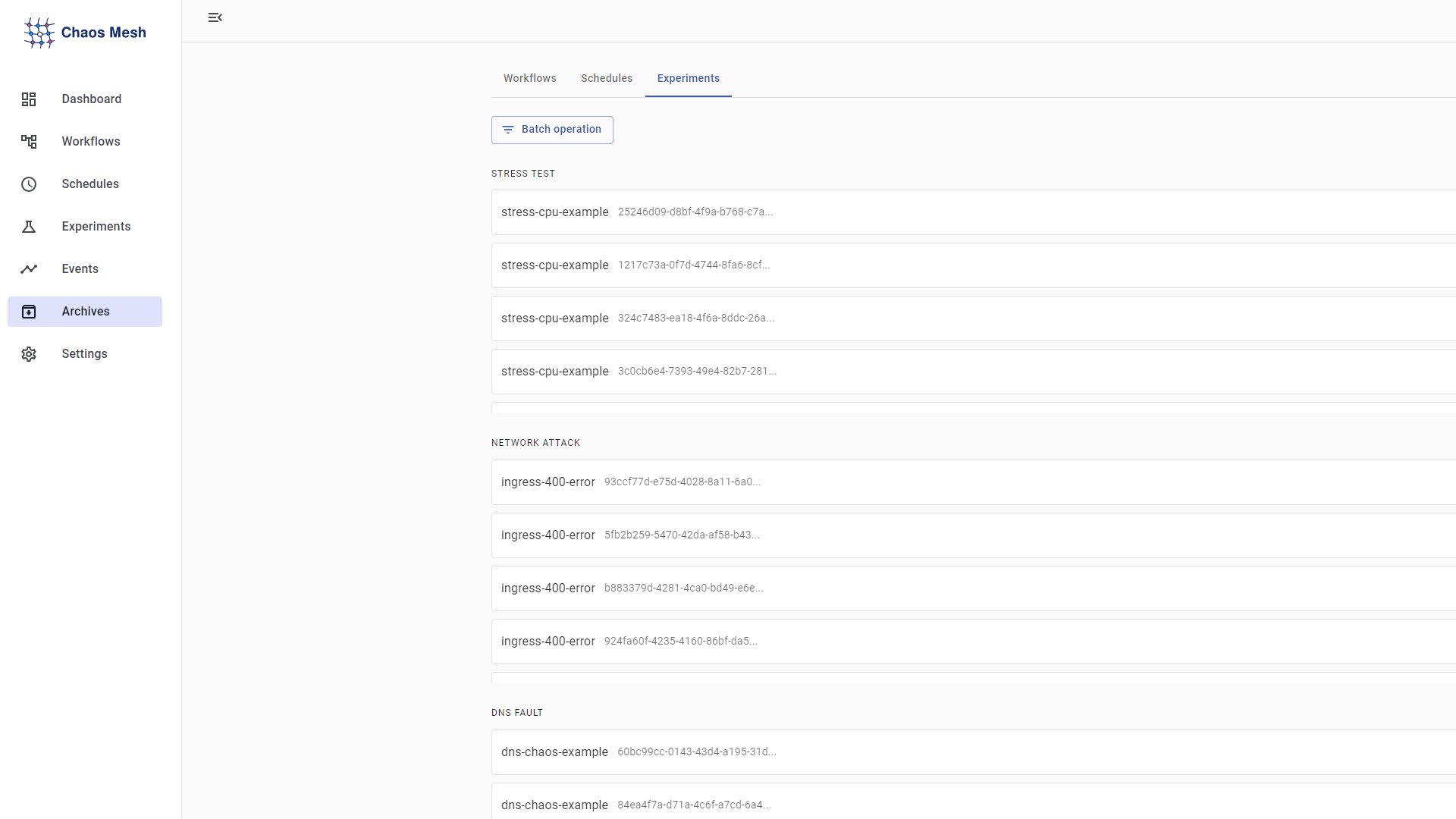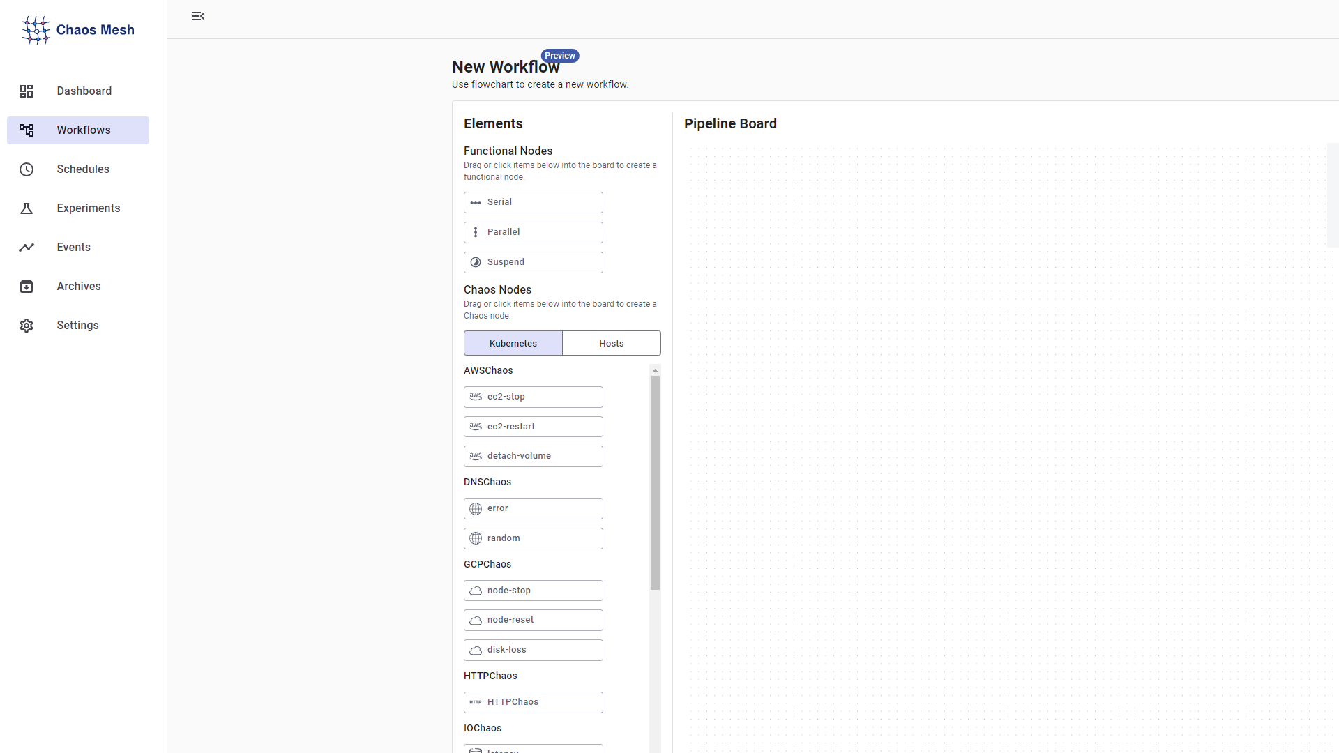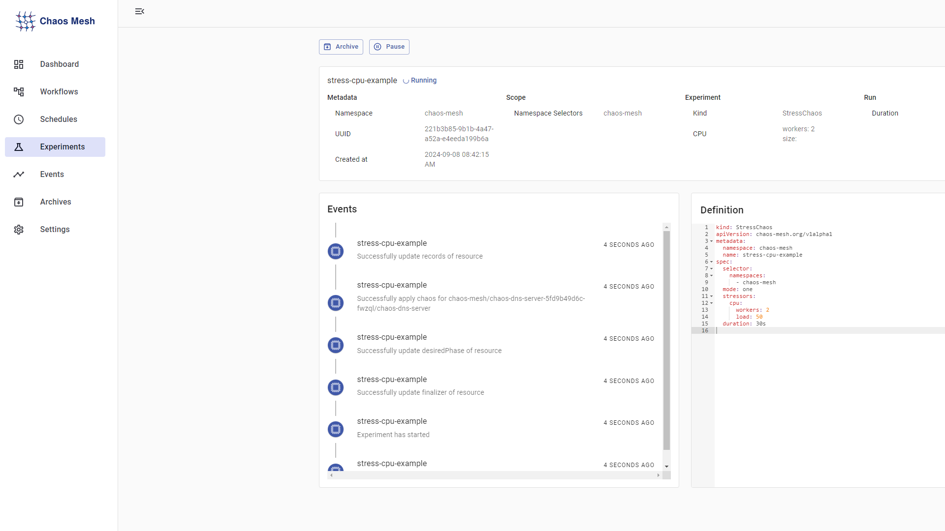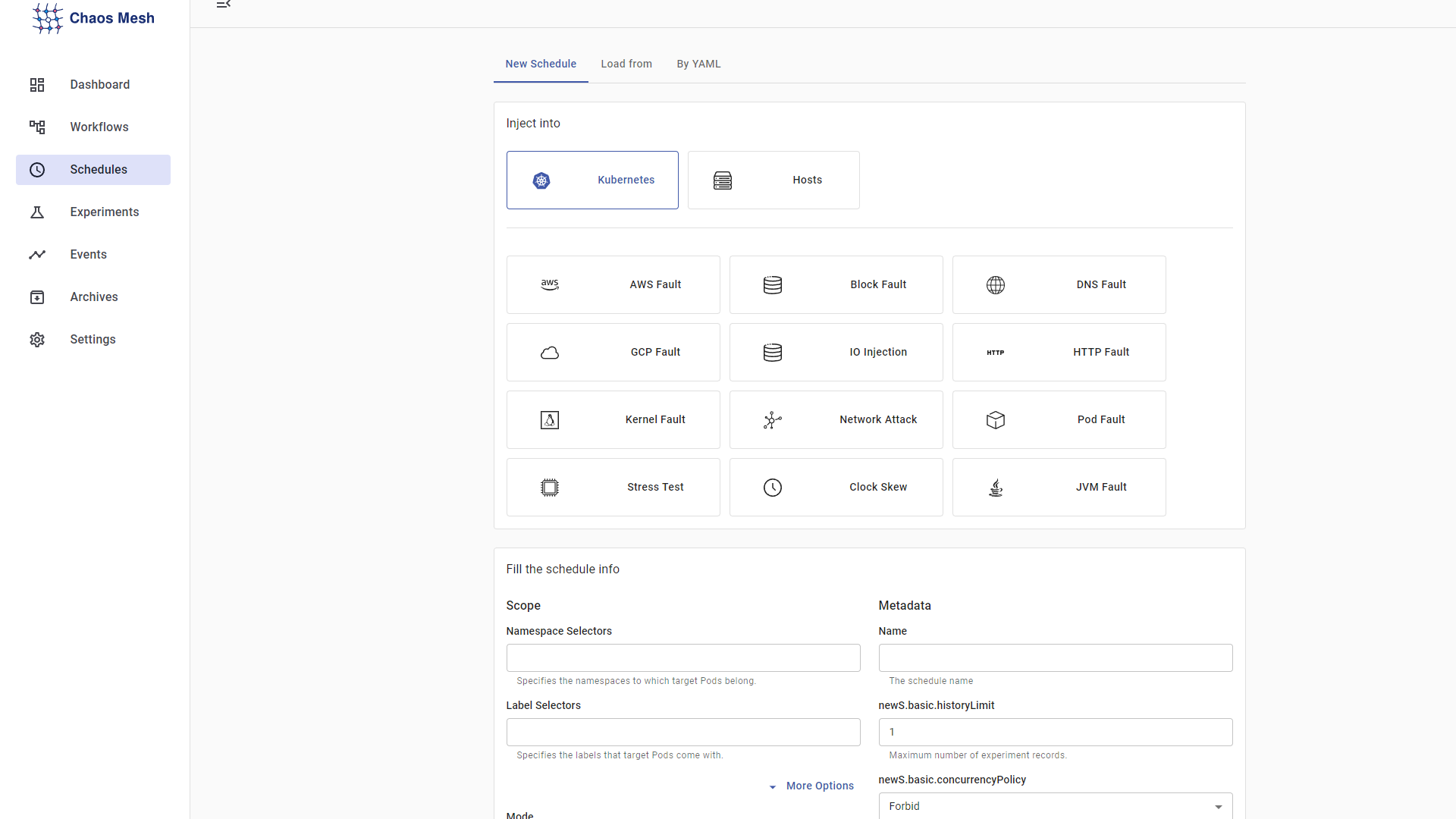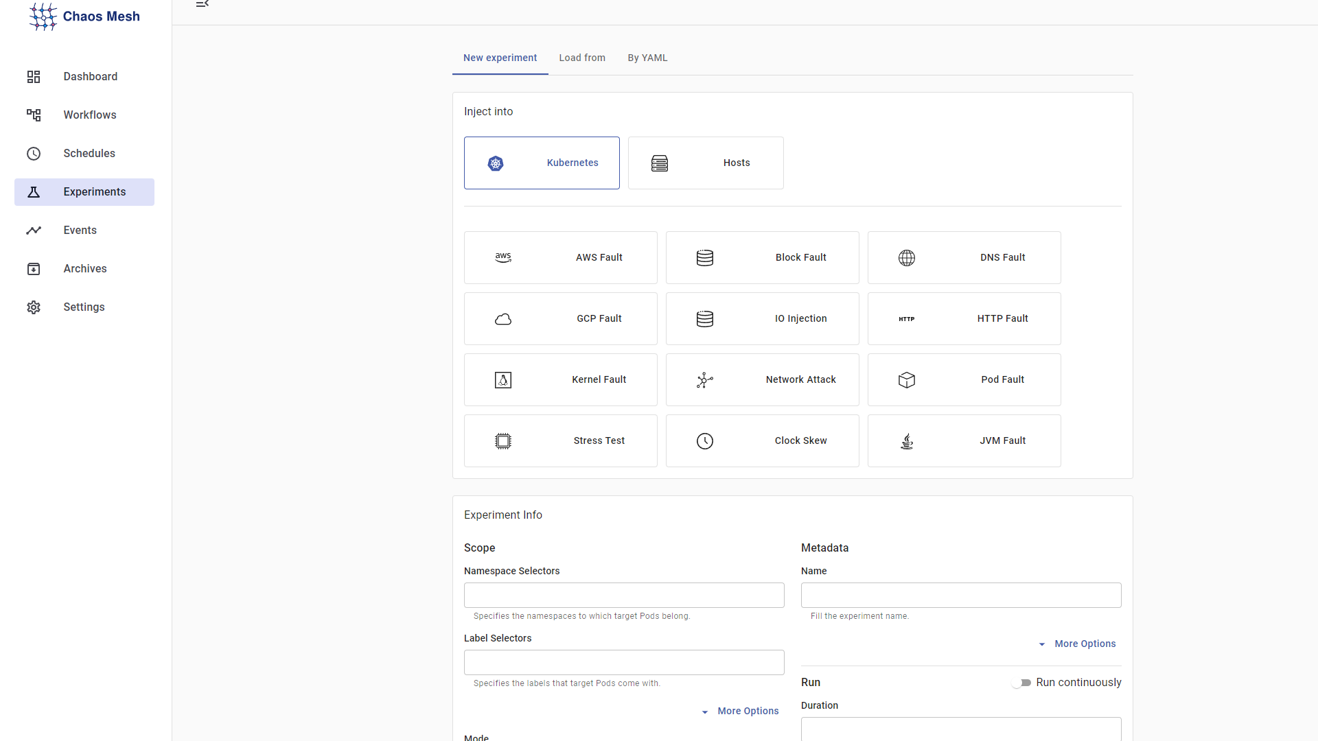 Experiments 탭에서는 쿠버네티스, 호스트에 개별적으로 장애를 주입할 수 있는 시나리오를 버튼과 텍스트 필드 형식으로 손쉽게 작성할 수 있다.