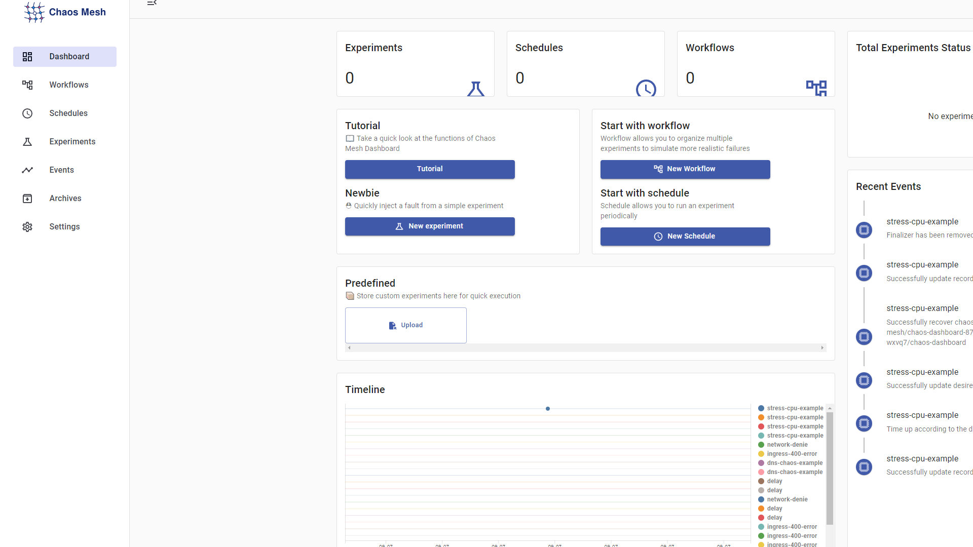 메인 페이지에는 왼쪽부터 각 서비스로 연결되는 버튼이 있으며, 현재 생성된 Experiments, Schedules, Workflows 수와 더불어 최근 이벤트를 확인할 수 있다.