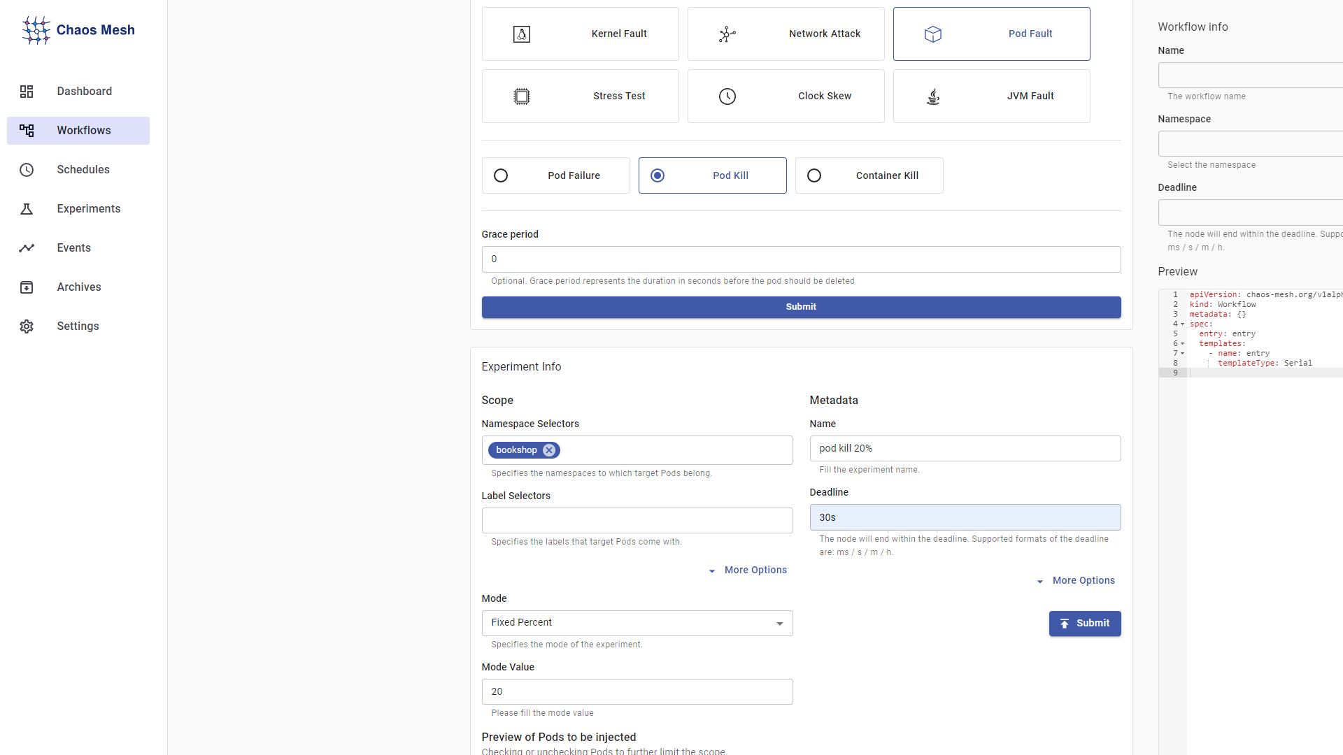 - Pod Failure : Pod에 오류를 주입하여 일정 시간 동안 Pod를 사용할 수 없게 만듦